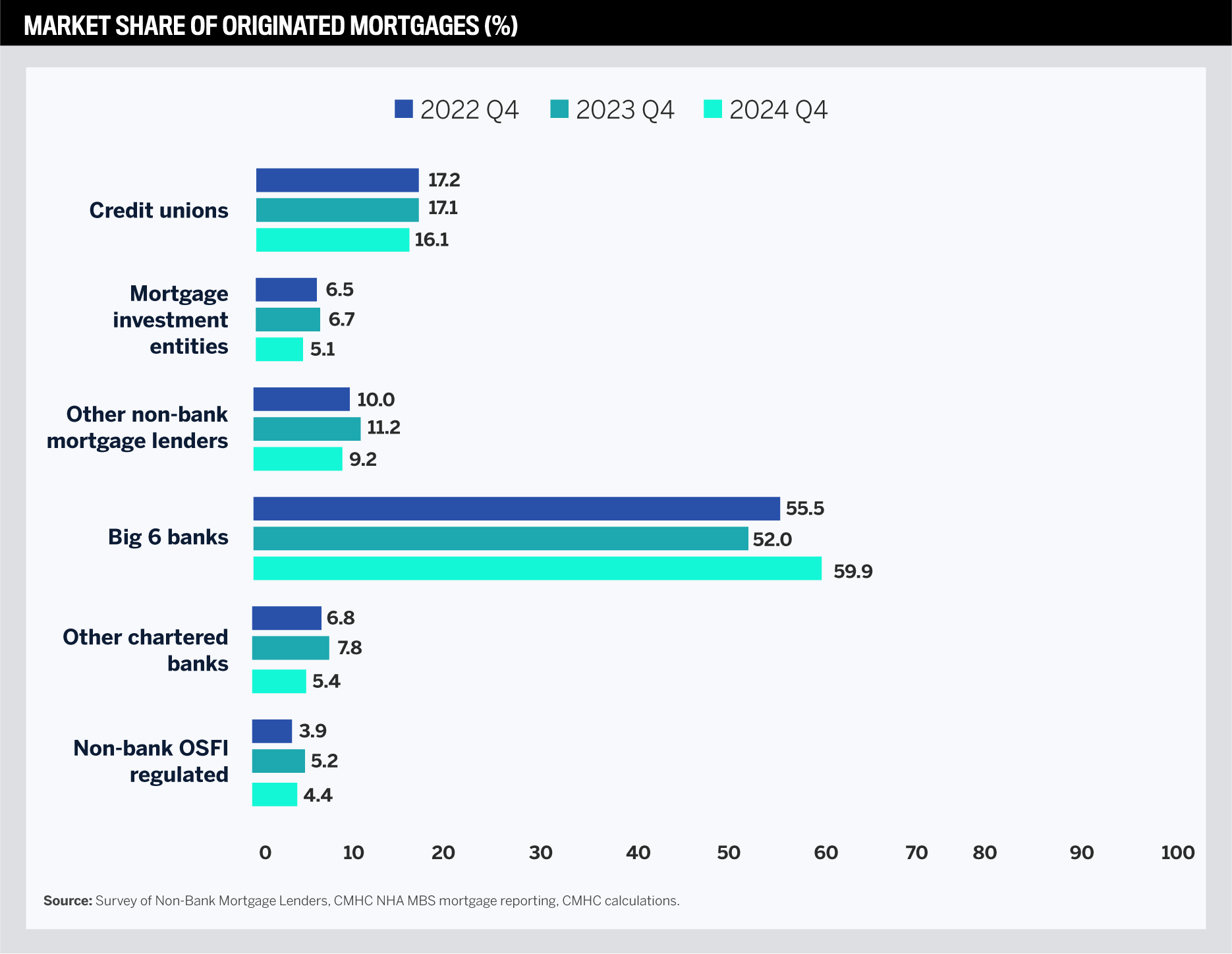 While the Big Six banks still dominate origination, their share dropped from nearly 60 percent in late 2022 to 52 percent by the end of 2023. Alternative and non-bank lenders, including credit unions, MICs, and private players, gained traction as borrowers turned to lenders that could move quickly and work around tighter approval rules. That change gave brokers more room to build new lender relationships, especially with those willing to adapt to credit or timing changes.
