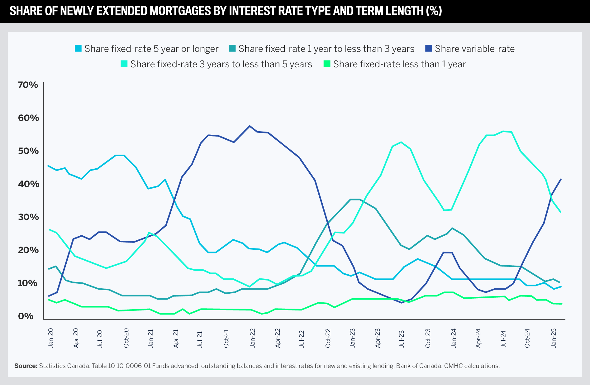 Variable rates make a comeback: With the Bank of Canada cutting rates seven times since mid-2024, variable-rate mortgages have climbed back to 42 percent of new originations. Shorter fixed terms are also gaining traction, reflecting borrower expectations of further rate relief.