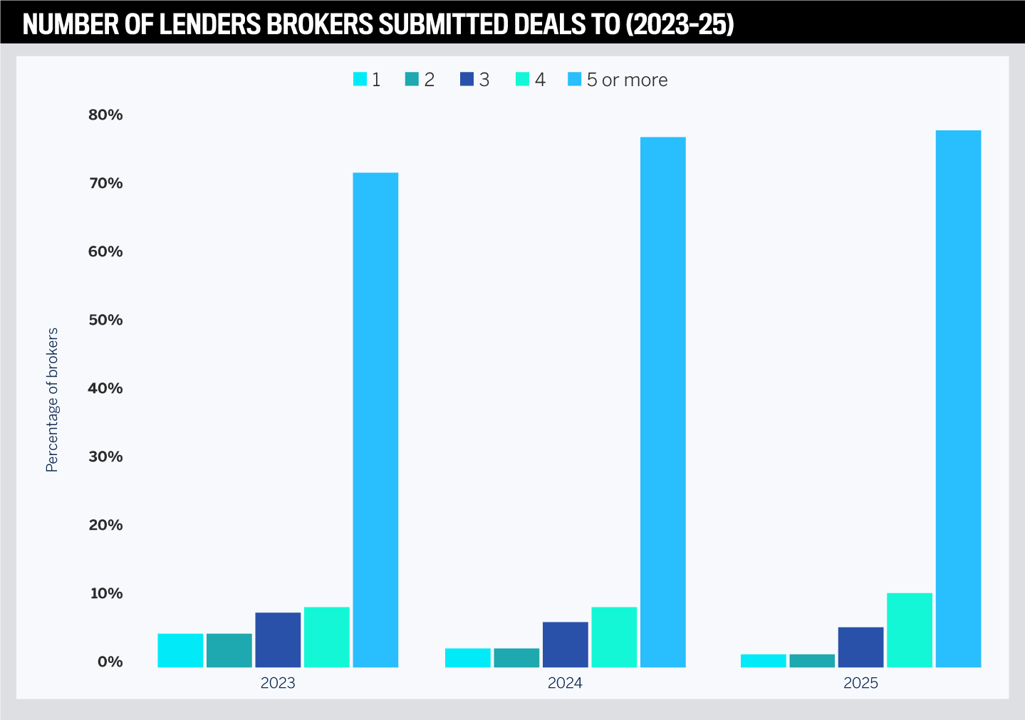 Multi-lender brokers are now the norm: Nearly 80 percent of brokers submitted deals to five or more lenders in 2025, up from 73 percent. Brokers are prioritizing results over history; if a lender can’t deliver, they’re out of the mix.