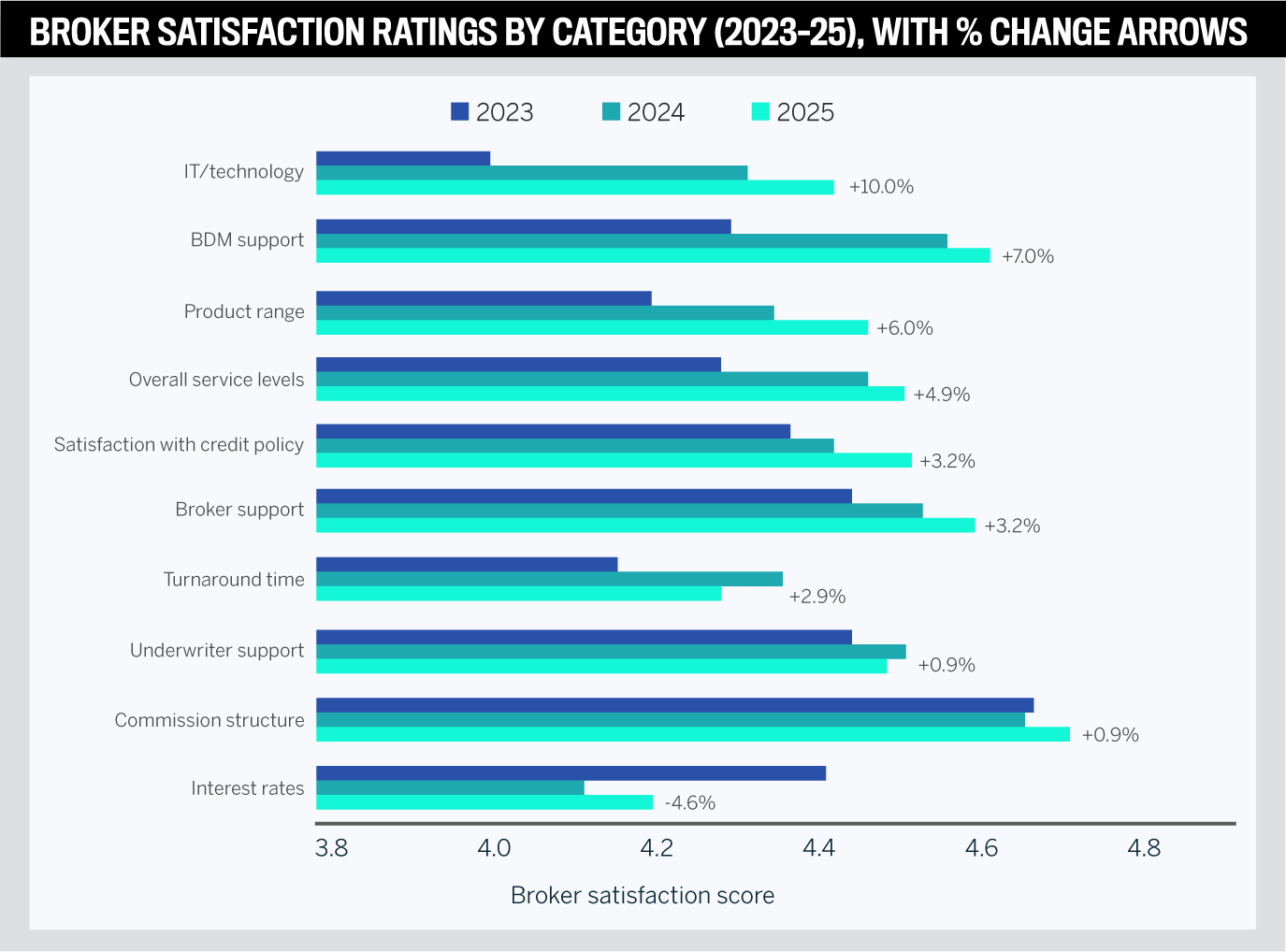 Product and service expansion: Product range improved 6 percent (from 4.19 to 4.44) and overall service levels rose 5 percent (4.27 to 4.48), as lenders broaden offerings and focus on consistent support for brokers.