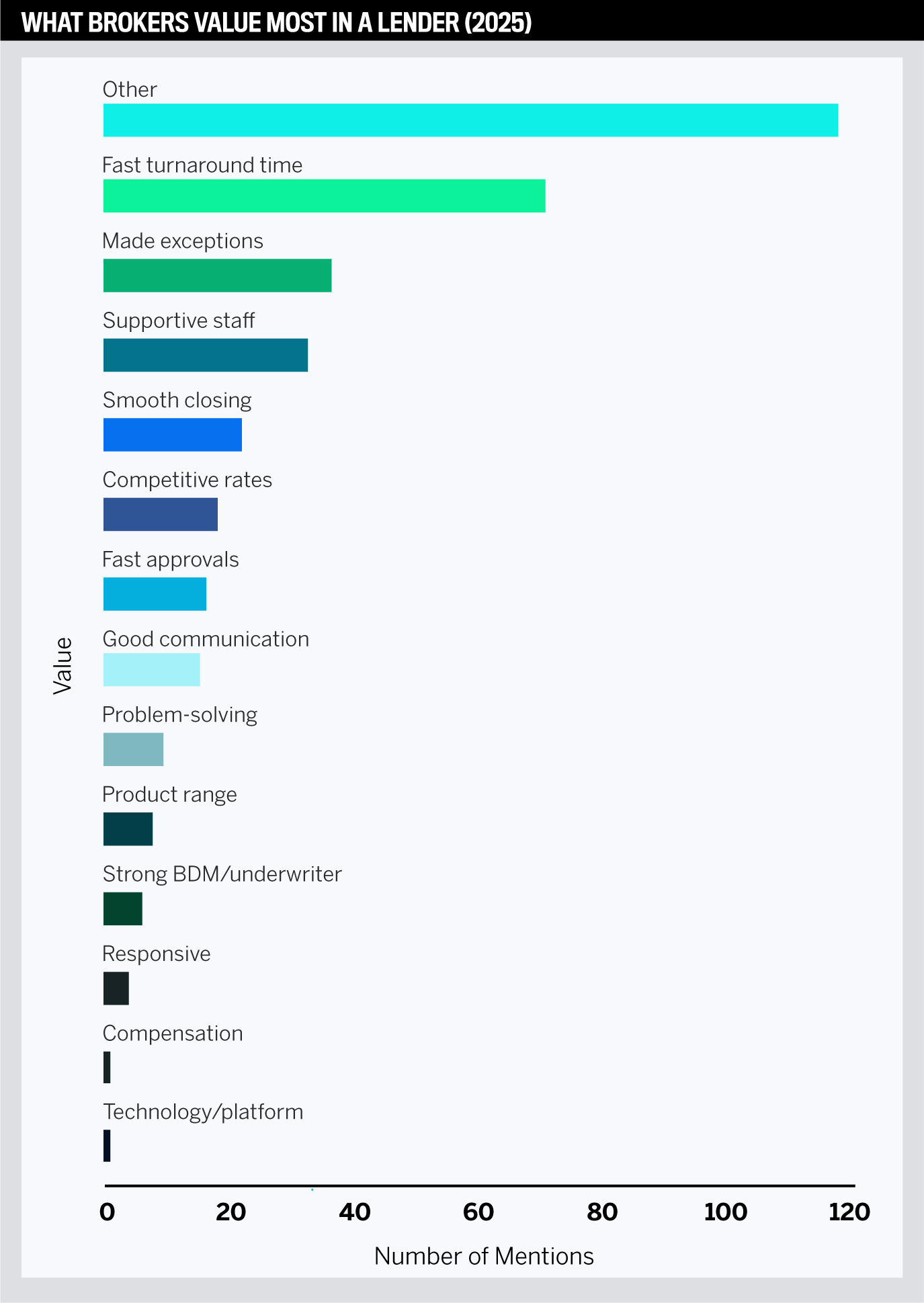 Speed and flexibility drive broker decisions: Turnaround time, underwriter access, and adaptable credit policies still tip the scale when brokers are deciding where to place tricky or time-sensitive files.