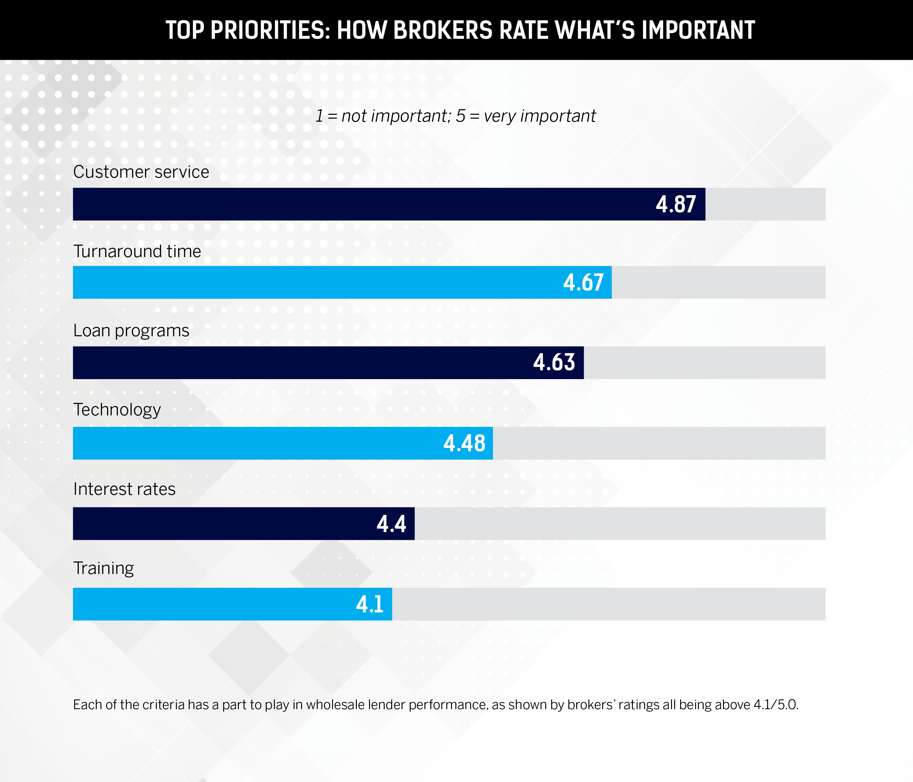 Brokers scored each criterion out of five. Lenders that achieved an average score of 4.0 or higher in each category were recognized as 5-Star Wholesale Lenders.