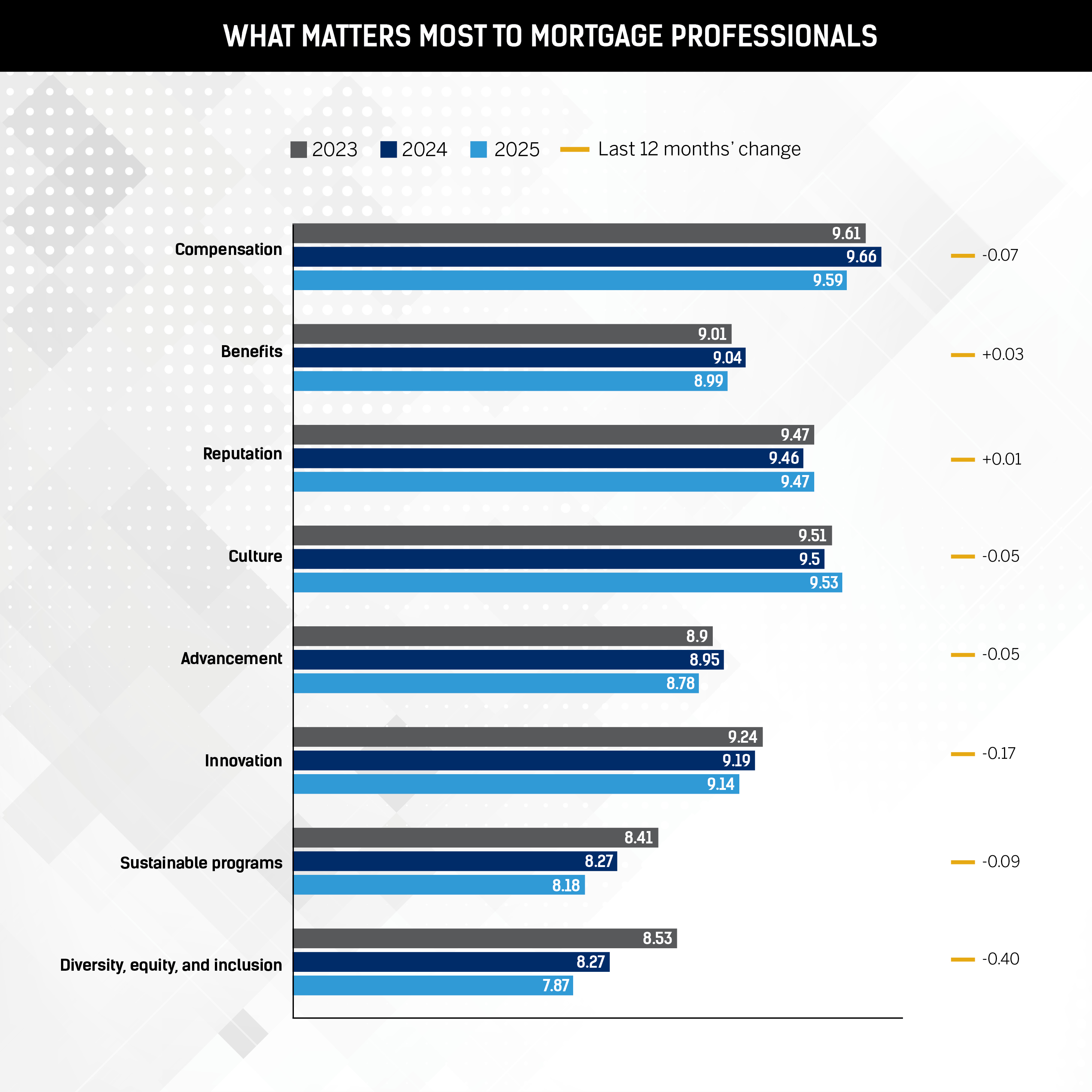 The rise in the relative importance of benefits and reputation, even if modest, is no surprise to Valerie Saunders, chief executive strategist at the National Association of Mortgage Brokers. “The mortgage industry operates on trust and relationships, and that dynamic extends directly to our employment relationships,” she says. “When skilled professionals are evaluating opportunities, they’re looking far beyond base salary and commission structures. In an industry where your professional reputation follows you throughout your career, people are incredibly cautious about associating with firms that might damage their standing.”