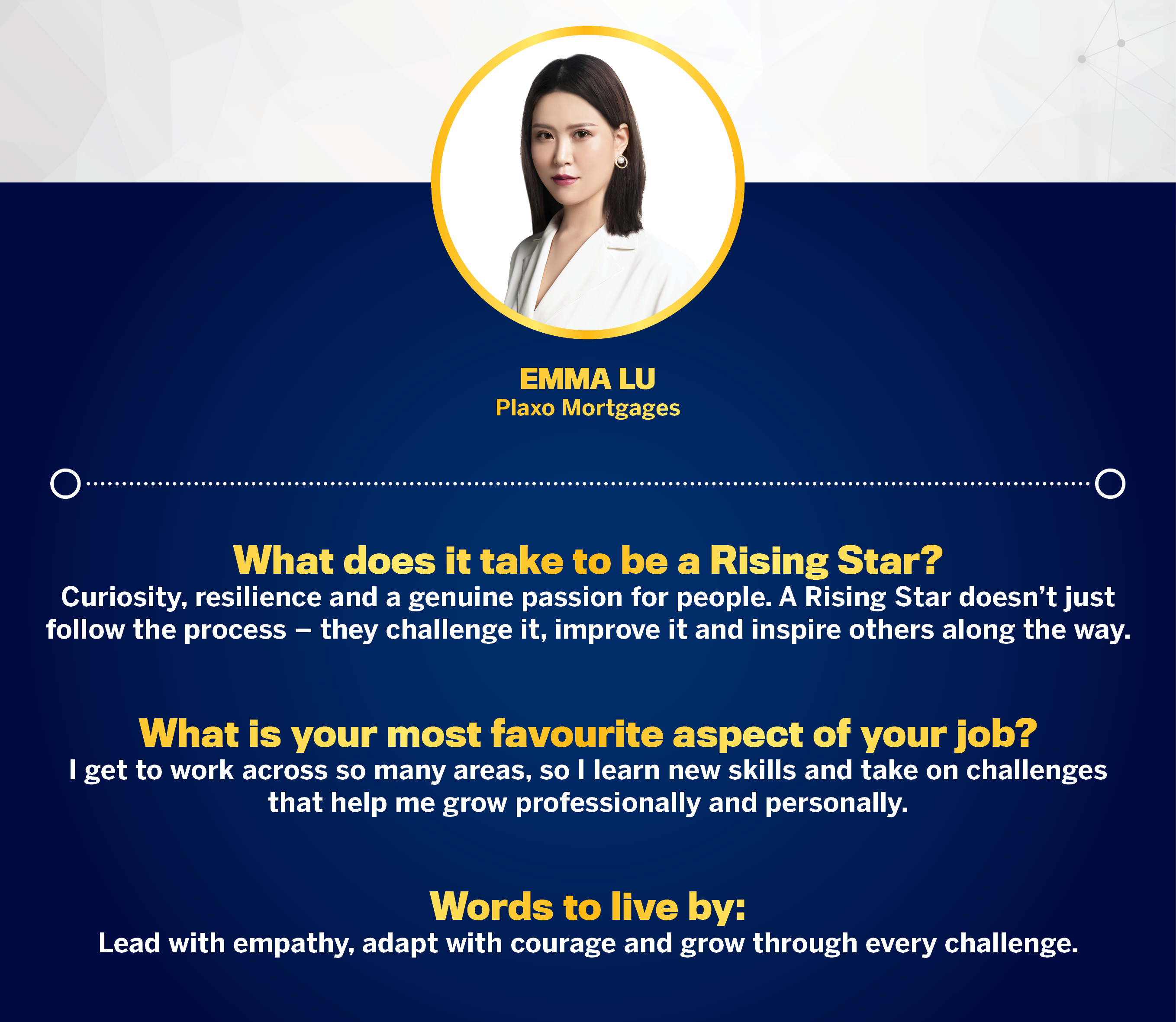 For Plaxo’s Lu, empathy is the foundation of her approach. “Leadership isn’t just about sales and targets; it’s about people,” she says. She recognises that every mortgage solution is unique and often emotionally charged, requiring advisers to listen, understand and balance practical solutions with genuine care.