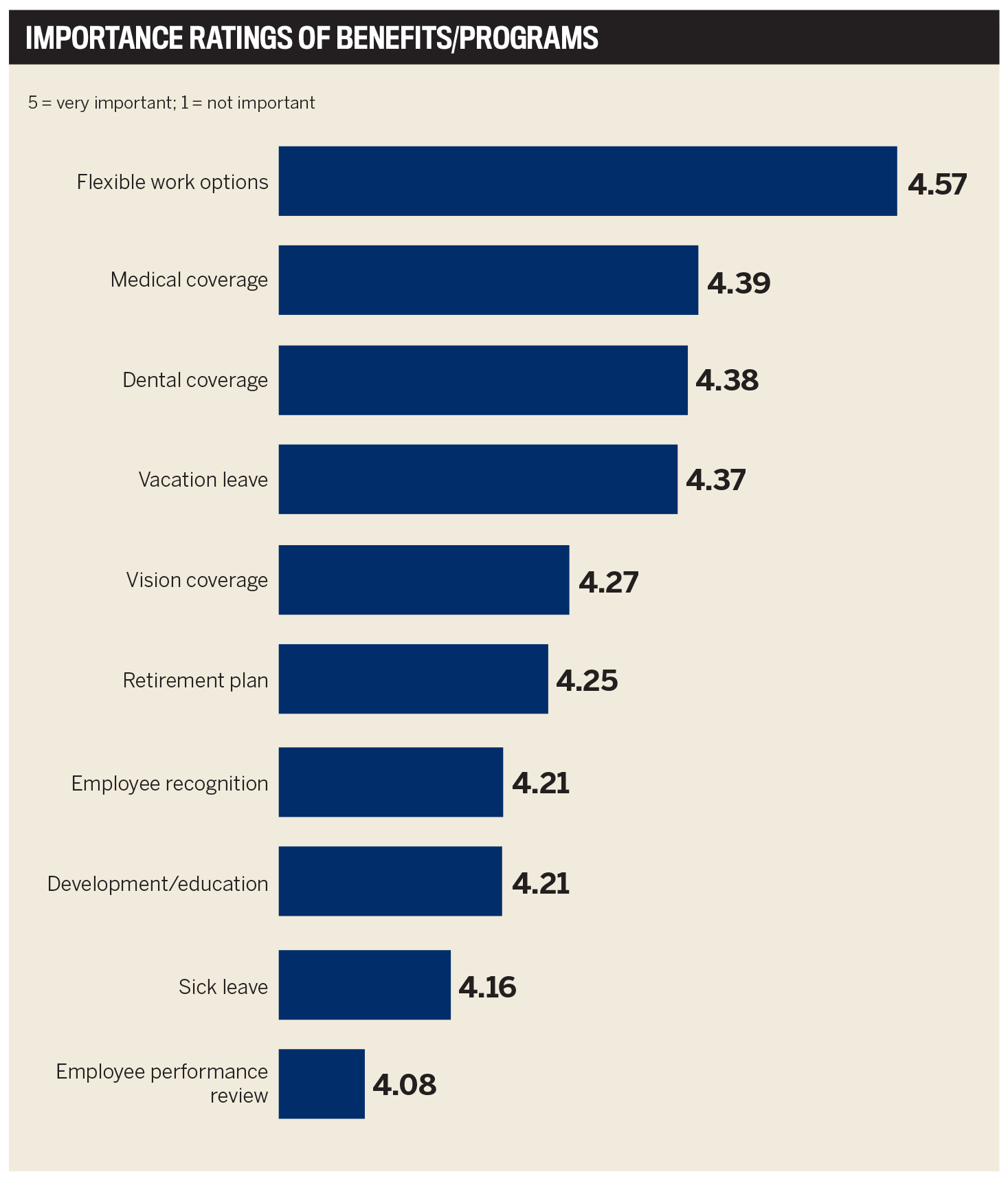 Flexible work options post the highest overall importance score at 4.57, with 837 respondents rating them “very important,” more than any other benefit.
