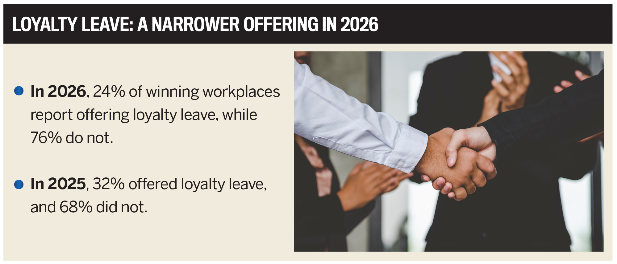 Takeaway: The eight-point decline suggests loyalty leave is not a defining feature of top-performing employers. As CMP’s 2026 data shows, employees place the greatest value on flexibility, core health benefits, and development; tenure-based perks appear secondary to the fundamentals that shape daily experience and long-term retention.