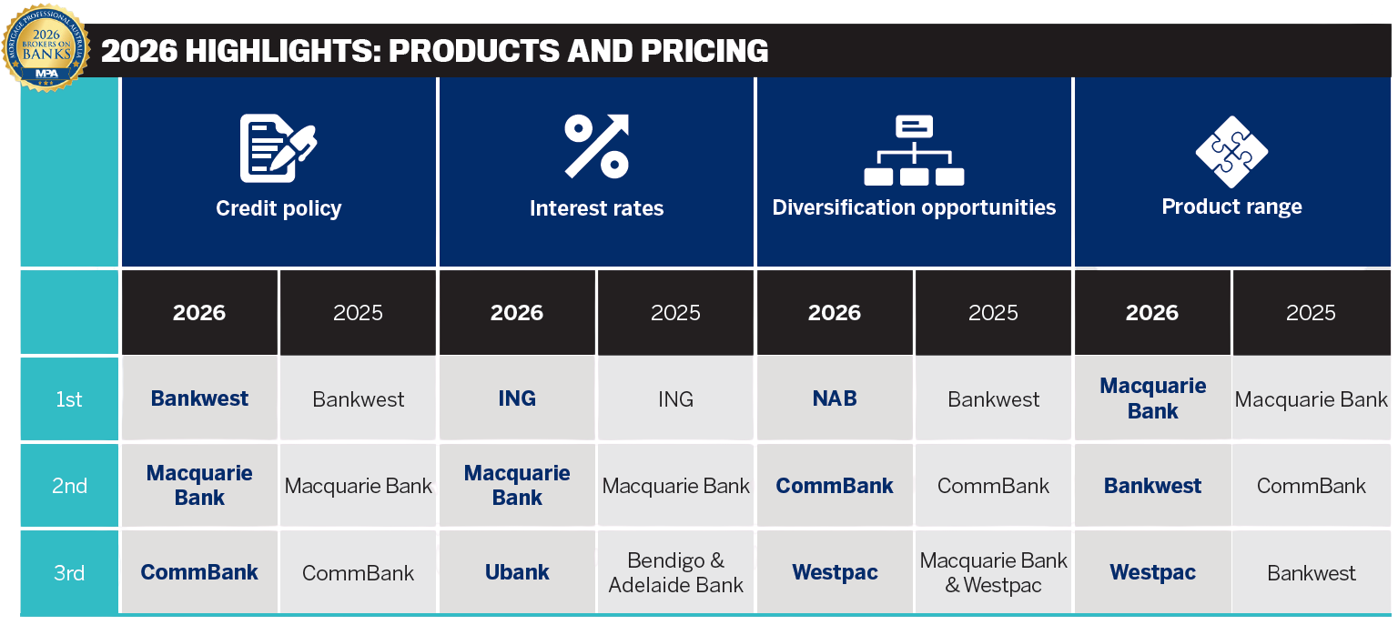Bankwest again topped the credit policy rankings, reflecting broker confidence in its approval consistency, with a hat-trick of wins since 2024.