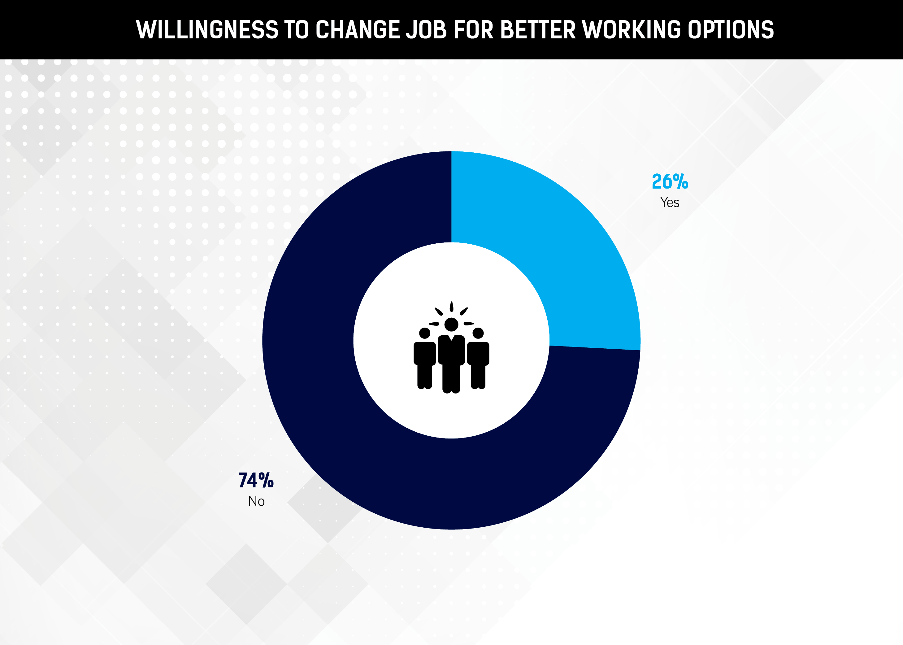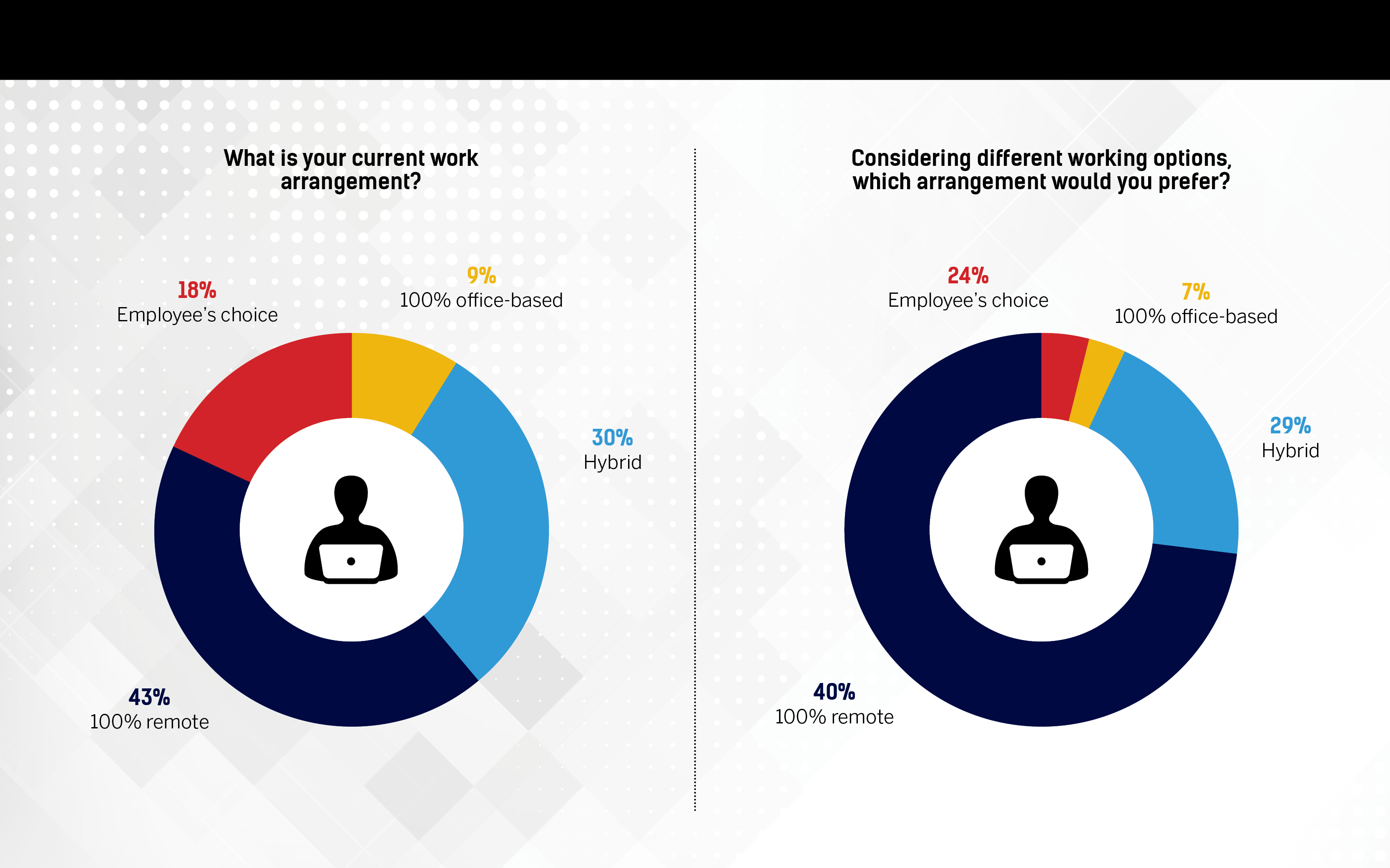 Respondent employees also shared their current and preferred work arrangements. The data shows 93 percent prefer not to be office-based, underlining the importance of flexibility and accommodation on the part of employers.