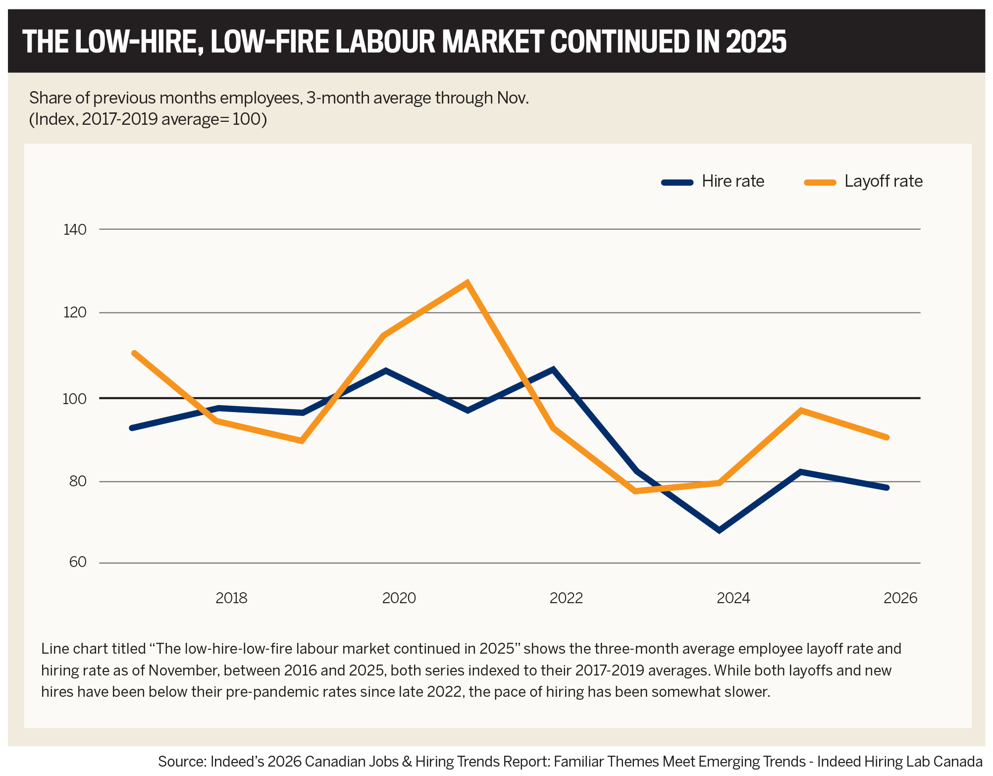 Over the three months to November 2025, hiring rates were down 22 percent compared to the 2017–2019 average, while layoffs were down 9 percent, reinforcing what the report called a “low-hire, low-fire labour market.”