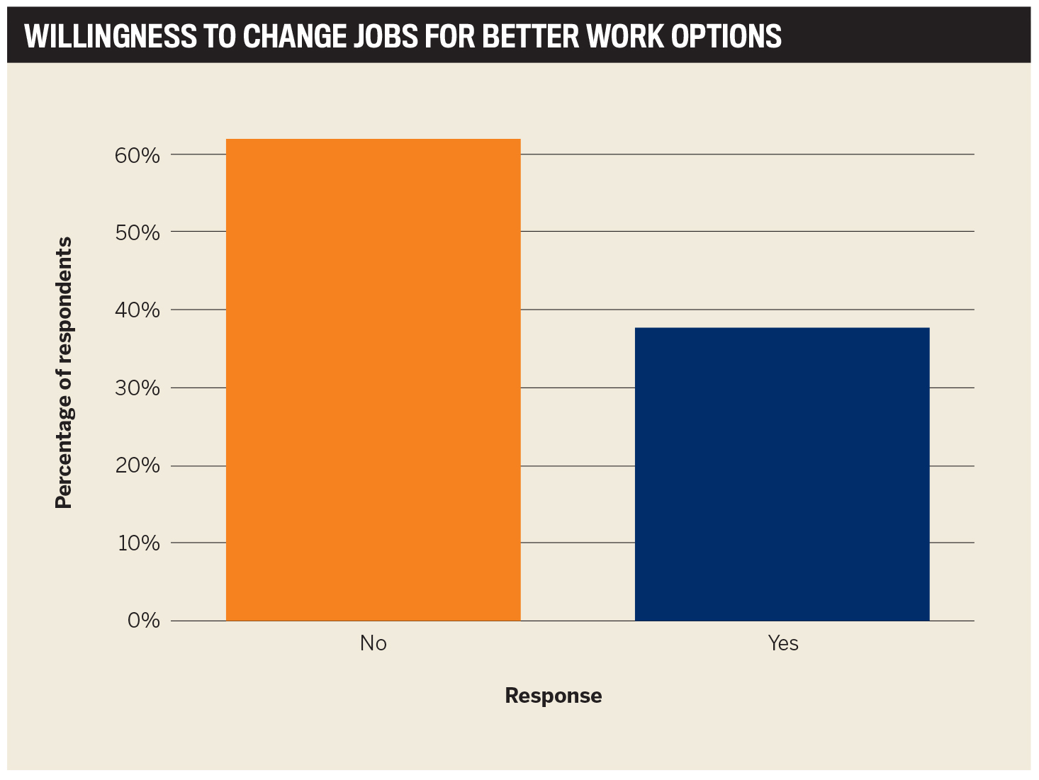Takeaway: More than one in three respondents would consider changing employers for improved work options. While a majority remain in place, flexibility and work design are influential enough to create measurable mobility risk for organizations that fall short of employee expectations.