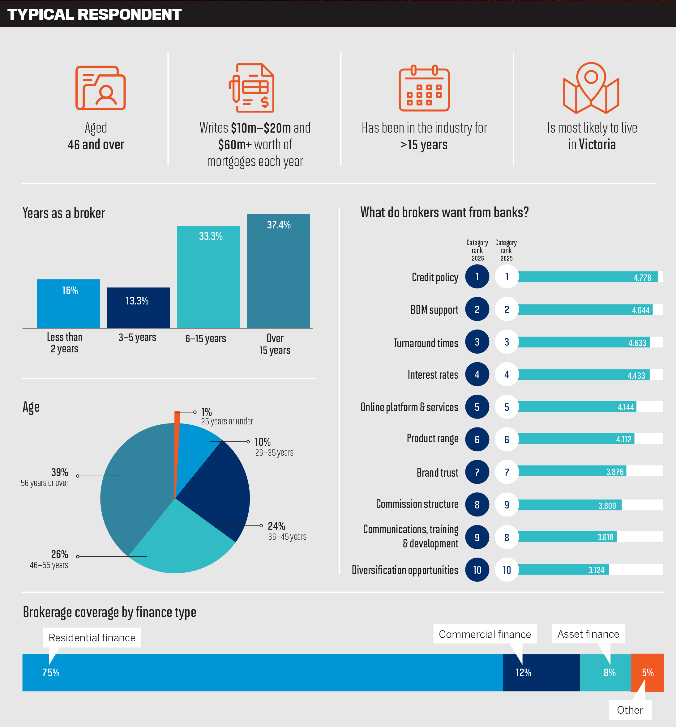 MPA’s Brokers on Banks 2026 is based on broker evaluations across 10 performance benchmarks and identifies the products and practices associated with top-performing banks. The data indicates a more experienced, higher-volume broker cohort who rely less on purely residential lending and serve a wider spectrum of client needs.