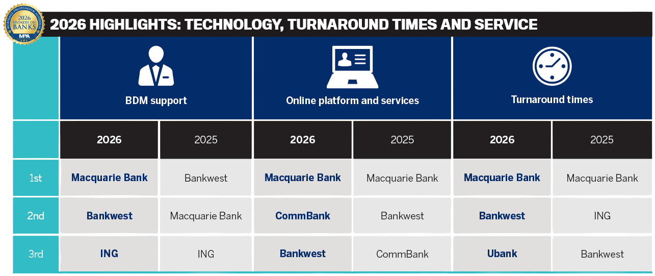 Here, execution again matters more than novelty. Macquarie Bank leads online platform and services for the second year, followed by CommBank and Bankwest. Brokers highlighted clean portals, local decisioning, systems supporting faster assessment, and some lenders’ incremental process improvements (eg in valuations and digital submissions).